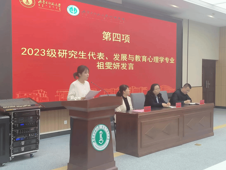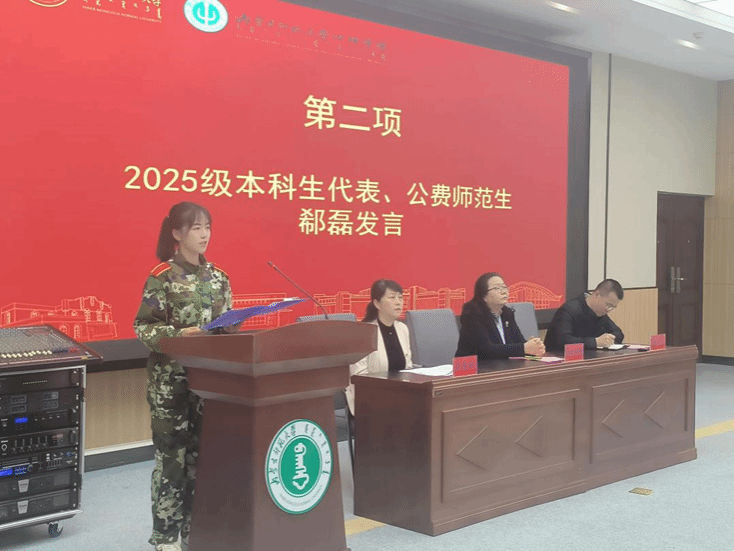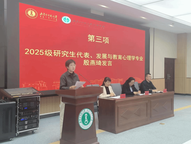 2025级心理学班郗磊作为本科生新生代表发言。她表达了对内蒙古师范大学心理学院的向往与期待,从个人与心理学结缘的经历出发,展现出新一代学子对学科的热爱以及对大学生活的憧憬。